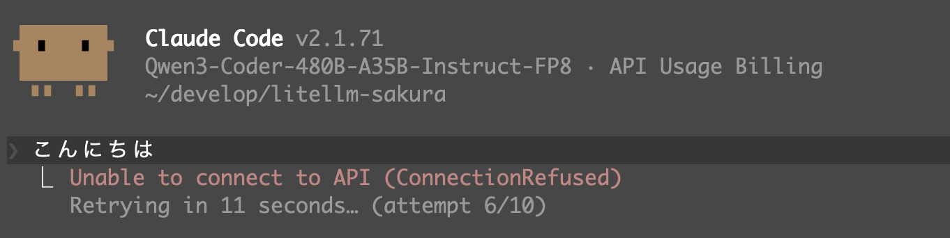 もし claude コマンド実行後、Unable to connect to API (ConnectionRefused) と出る場合は、LiteLLM proxy が停止しているか、何か設定がおかしい可能性があります。手順を見直します。