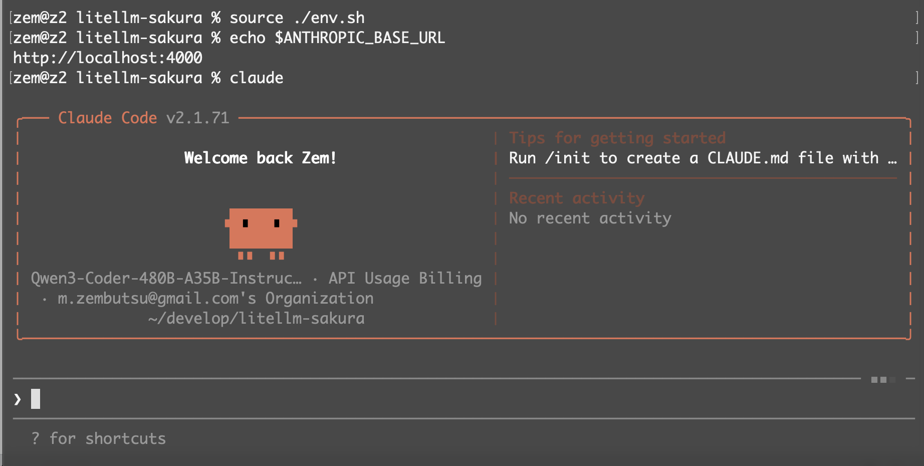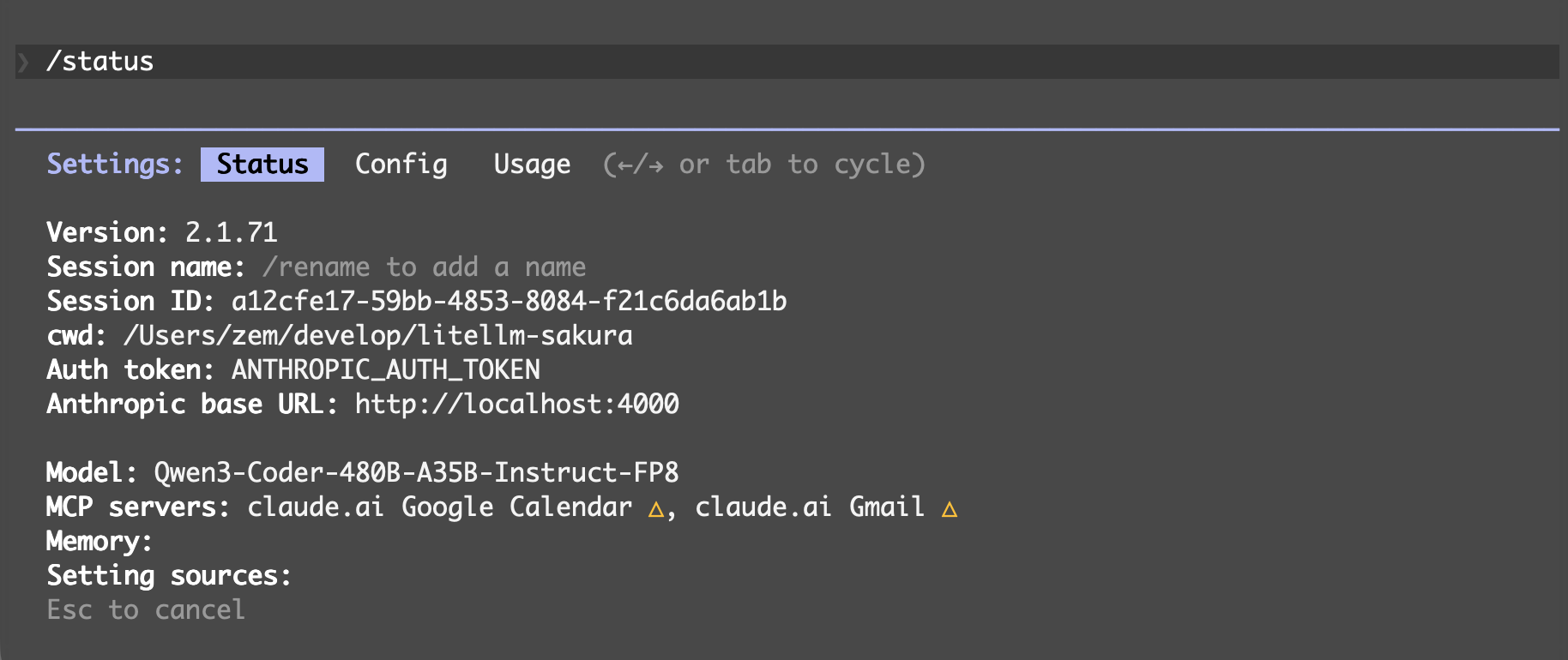 これで準備は調いました。あとは claude を実行したら自動的にさくらの AI Engine 側のモデルを参照した状態で起動できます。