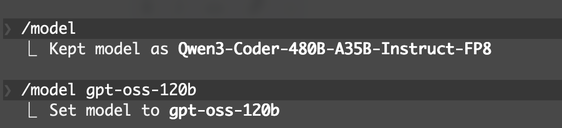 モデルを切り替え得たい場合は /model gpt-oss-120b のようにモデル名を指定します。